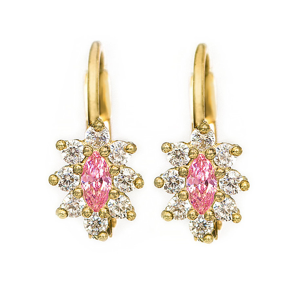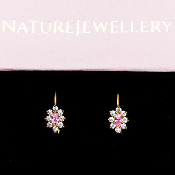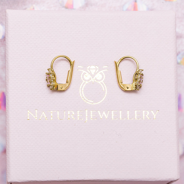Piękne, urocze i delikatne kolczyki z kwiatuszkami. Całość wykonana ze złota próby 333 (8K), zdobiona cyrkoniami bezbarwnymi i w kolorze delikatnego różu. Cyrkonie są wysokiej jakości i bardzo intensywnie się mienią.