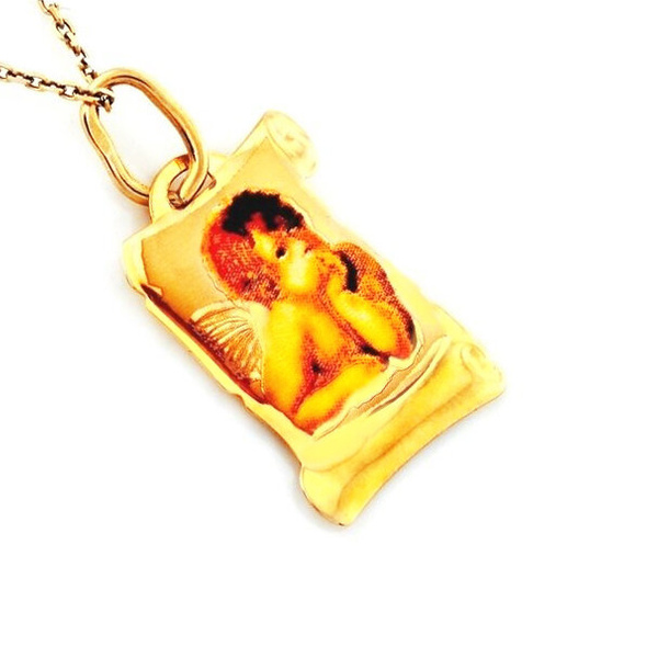 Piękna, złota zawieszka - zwój papirusu, z wizerunkiem kolorowego aniołka. Całość wykonana ze złota próby 585.