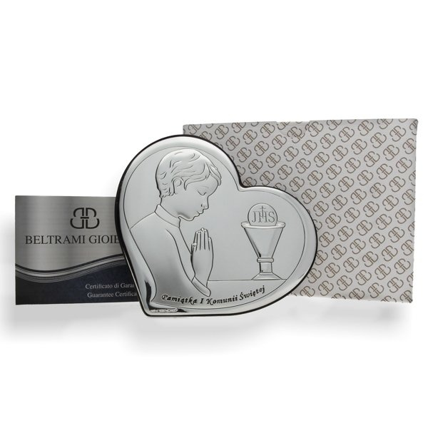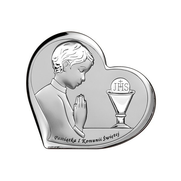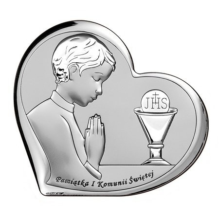 • Srebrny obrazek przedstawiający wizerunek modlącego się chłopca przyjmującego Pierwszą Komunię Świętą.