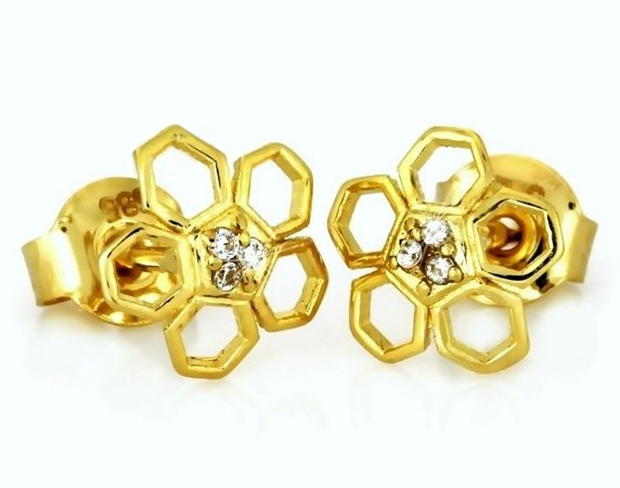 Prześliczne kolczyki - sztyfty, w kształcie delikatnych kwiatuszków. Całość wykonana ze złota próby 585, ozdobiona drobniutkimi cyrkoniami.