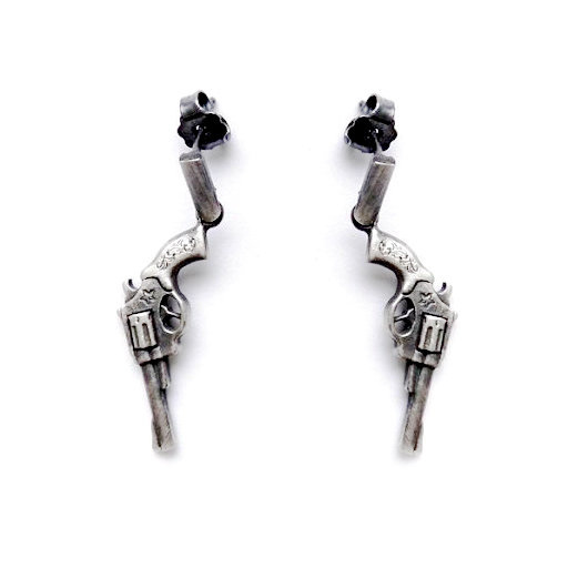 Oryginalne i zabawne kolczyki srebrne próby 925 w kształcie rewolwerów na zapięciach typu sztyft. Kolczyki zostały ręcznie pokryte oksydą, a następnie wypolerowanie, dzięki czemu uzyskały ciekawy efekt w stylu "vintage". Rewelacyjny prezent dla każdej kobiety, szczególnie takiej, która lubi zwracać uwagę otoczenia. Do kompletu można dokupić zawieszkę.
