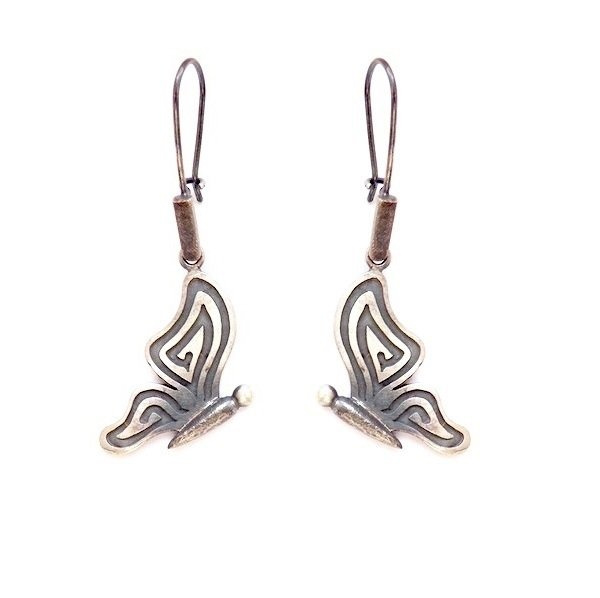 Oryginalne wiszące kolczyki srebrne w kształcie dwóch motyli. Całość wykonana ze srebra próby 925, została dodatkowo ręcznie pokryta ciemną oksydą, dzięki czemu cały wzór uzyskał rewelacyjny efekt "starego srebra" w modnym obecnie stylu Vintage.