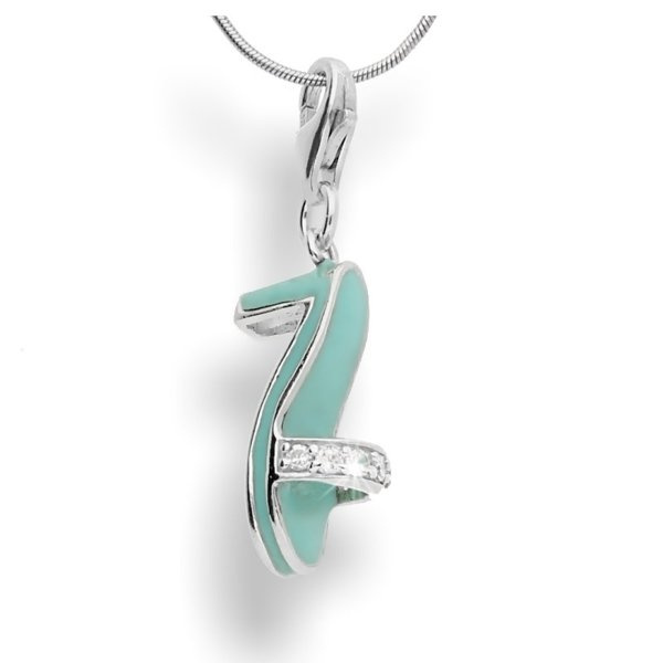 Prześliczna zawieszka do bransoletki typu charms w kształcie błękitnego klapka na obcasie. Całość wykonana ze srebra próby 925, pokryta błękitną emalią i ozdobiona cyrkoniami najwyższej jakości. Będą rewelacyjnym prezentem dla każdej kobiety kochającej modę. Istnieje możliwość bezpłatnej wymiany karabińczyka do bransoletki na wisiorek do łańcuszka lub zawieszkę do bransoletki typu Pandora.