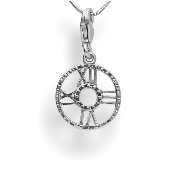 Przepiękna zawieszka srebrna do bransoletki typu charms z oryginalnym motywem tarczy zegarowej. Rewelacyjny, delikatny wzór w całości wykonany ze srebra próby 925.