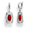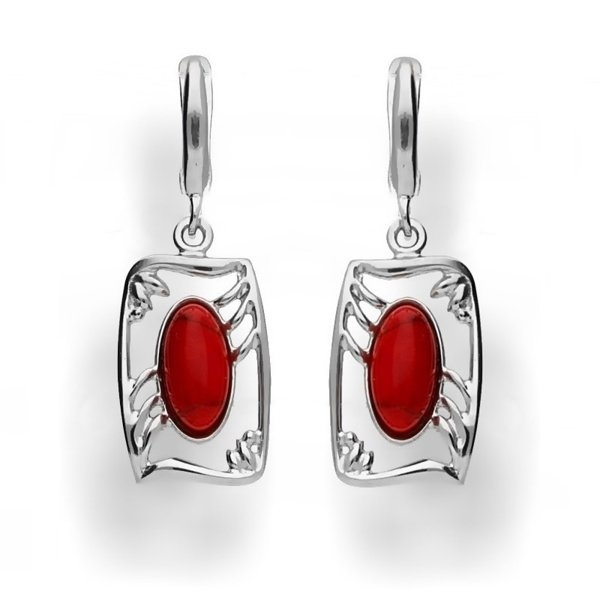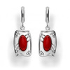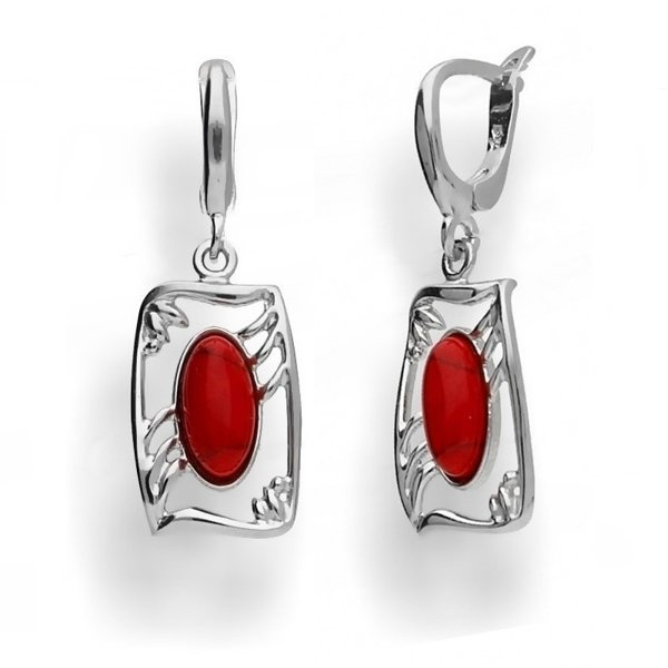Prześliczne, efektowne kolczyki srebrne próby 925, z pięknym, ozdobnym motywem i osadzonym koralowym kamieniem jubilerskim. Klasyczny i uniwersalny wzór, który nadaje się dla każdej kobiety.