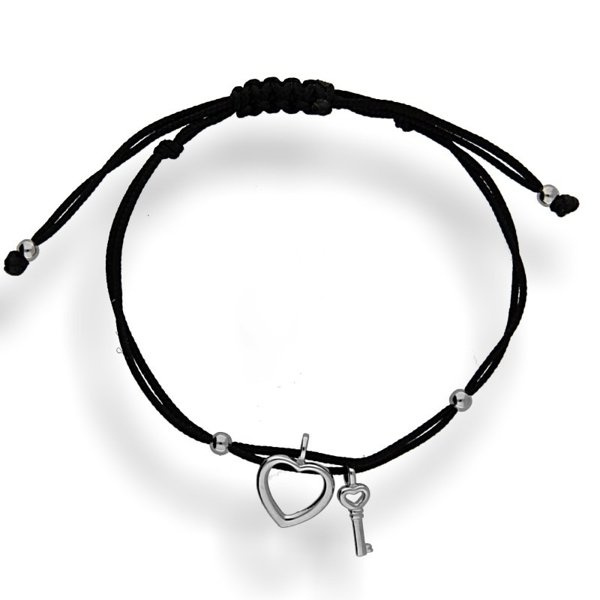 Przepiękna bransoletka sznurkowa z oryginalnymi, srebrnymi elementami ozdobnymi w kształcie serduszka i kluczyka.