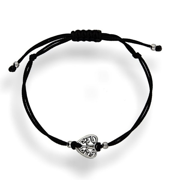 Przepiękna bransoletka sznurkowa z oryginalnym, srebrnym elementem ozdobnym w kształcie pięknie zdobionego serca.
