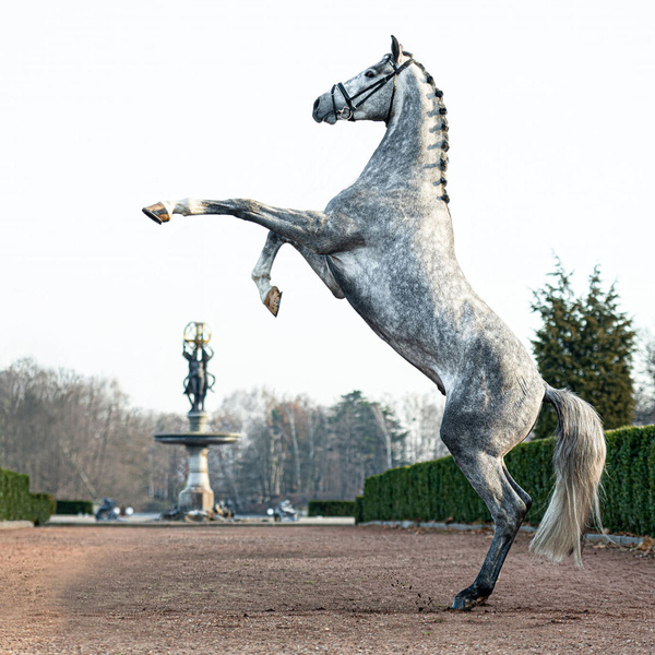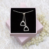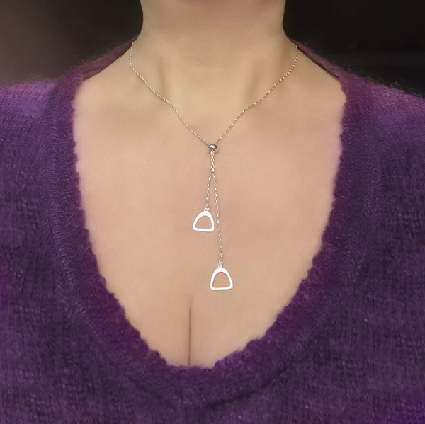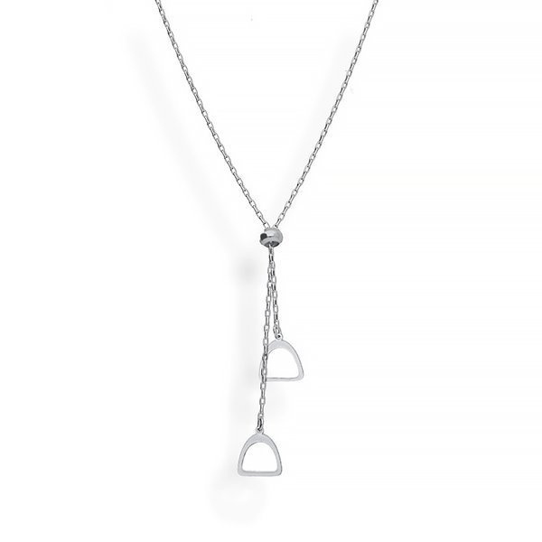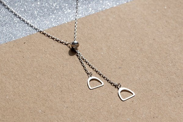 Wyjątkowy, srebrny naszyjnik ze strzemionami z serii kolekcji jeździeckiej.Jest regulowany za pomocą srebrnej kuleczki.