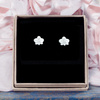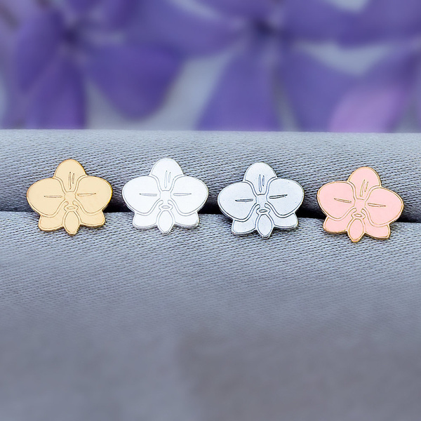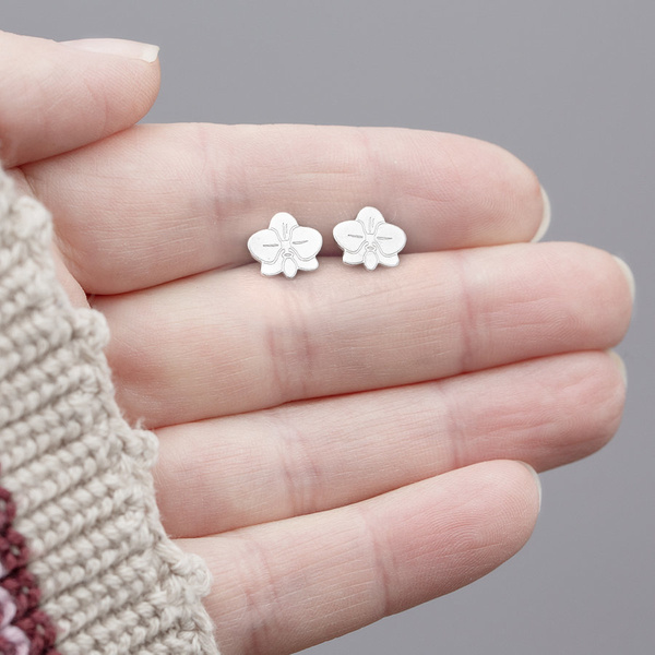 Piękne, eleganckie i uniwersalne kolczyki srebrne, próby 925, w kształcie kwiatu orchidei. Dodatkowo, by zabezpieczyć srebro przed ciemnieniem zostały pokryte rodem.