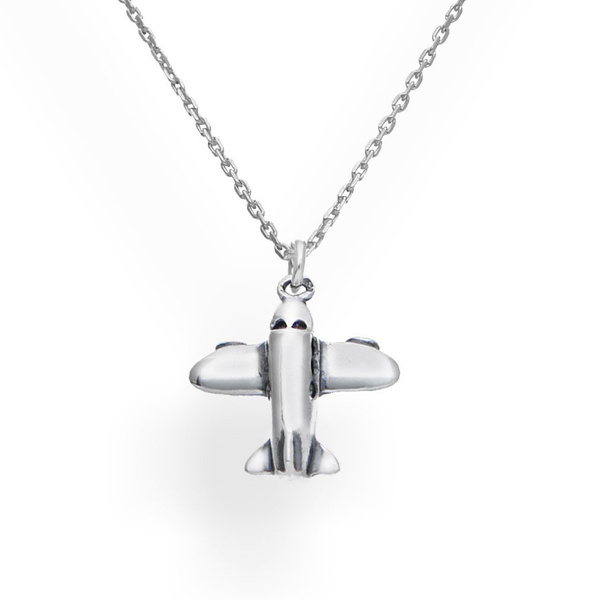 Przepiękny naszyjnik z precyzyjne wykonaną zawieszką w kształcie samolotu. Wzór w całości został wykonany ze srebra próby 925.