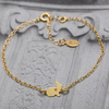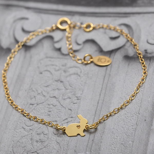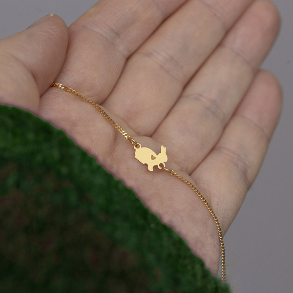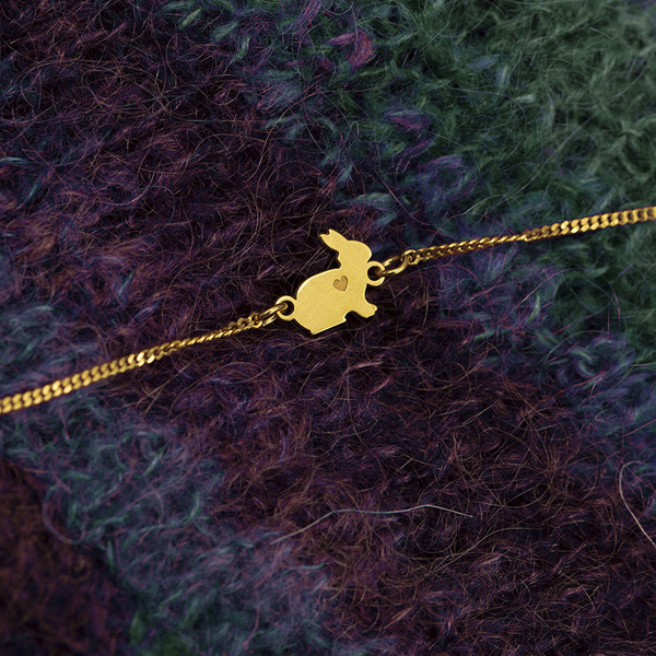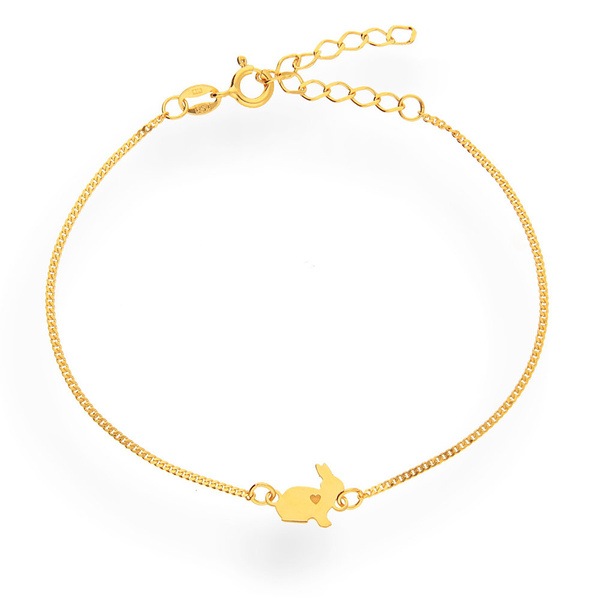 Srebrna bransoletka z delikatnego łańcuszka tzw. pancerki, z uroczą zawieszką w kształcie zajączka z wygrawerowanym serduszkiem.