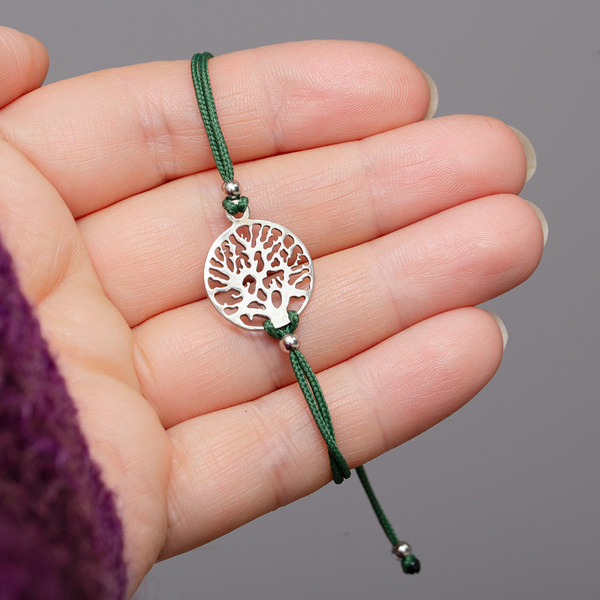 Przepiękna i bardzo wygodna w noszeniu bransoletka na sznurku w kolorze zielonym z ażurowym elementem srebrnym p. 925.