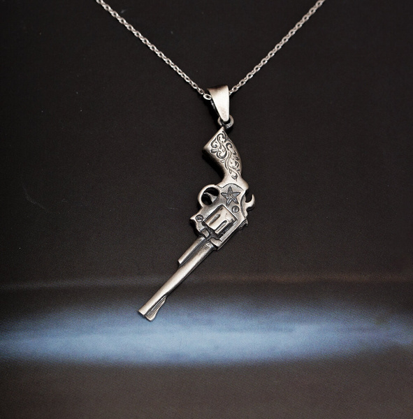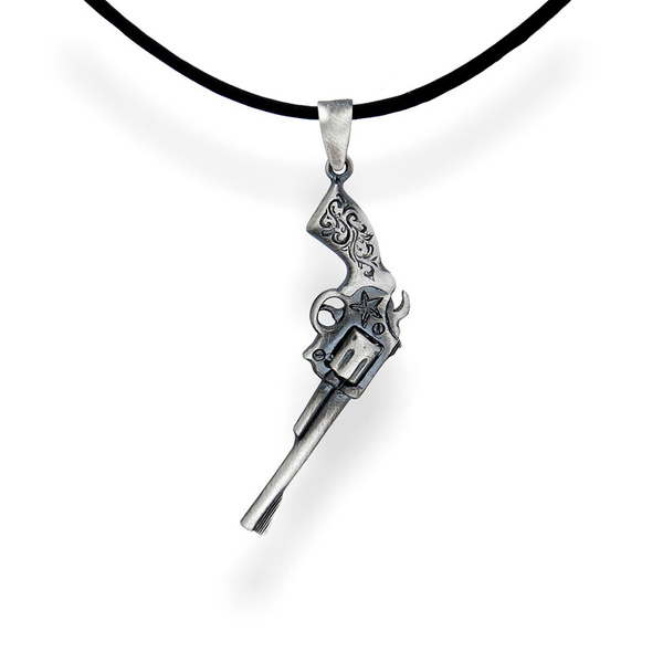 Przepiękny wisiorek na naturalnym rzemieniu z rewolwerem. Zawieszka została wykonana ze srebra próby 925, została ręcznie zaoksydowana i wypolerowana, dzięki czemu uzyskała interesujący efekt nawiązujący do modnego obecnie stylu Vintage.
