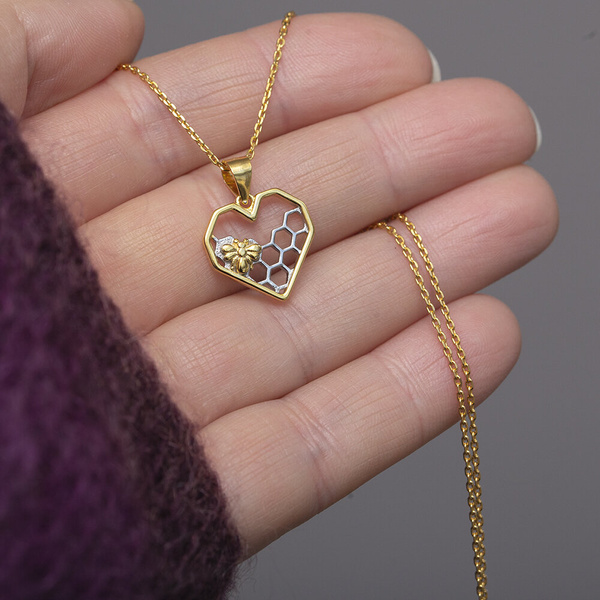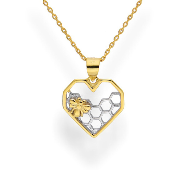 Uroczy naszyjnik z pszczółką i plastrem miodu, wykonany ze srebra p. 925 pozłoconego złotem 24K i rodem.