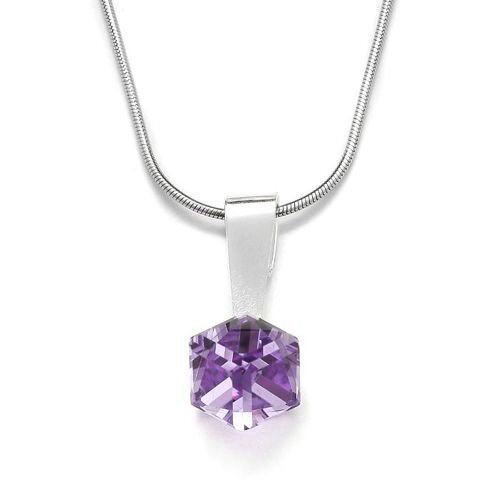 Srebrna zawieszka w kształcie kostki z kryształkiem Swarovski Crystals w kolorze fioletowym.