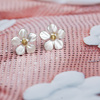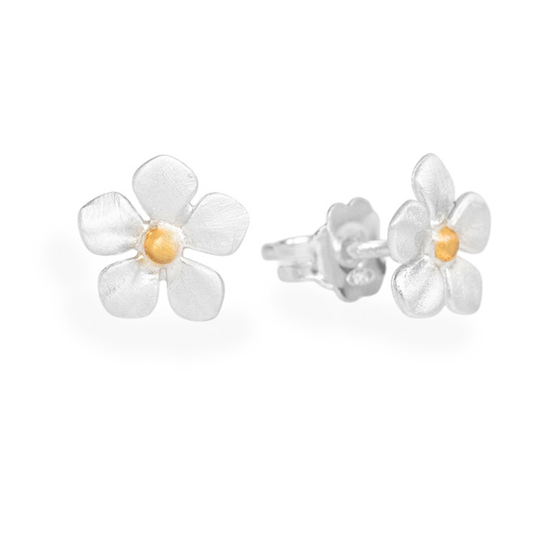 Satynowe kolczyki z niezapominajkami wykonane ze srebra p. 925. Środek kwiatka został pozłocony zlotem 24K.