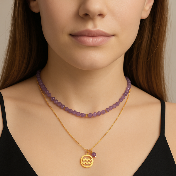 Naszyjnik świetnie komponuje się w parze z drugim naszyjnikiem, który ma zawieszki ze znakiem zodiaku i jednym kamieniem ametystu (można go kupić w innej ofercie). Dzięki czemu tworzą spójną i elegancką całość.