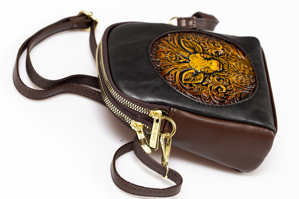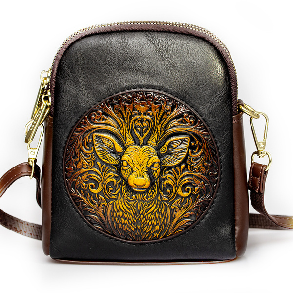 Śliczna, mała torebka z wytłoczonym wzorem przedstawiającym jelenia.