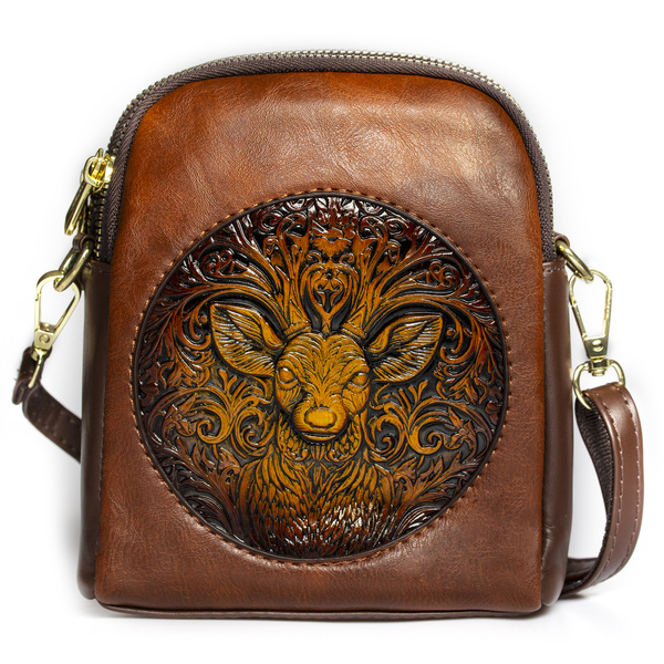 Śliczna, mała torebka z wytłoczonym wzorem przedstawiającym jelenia.