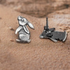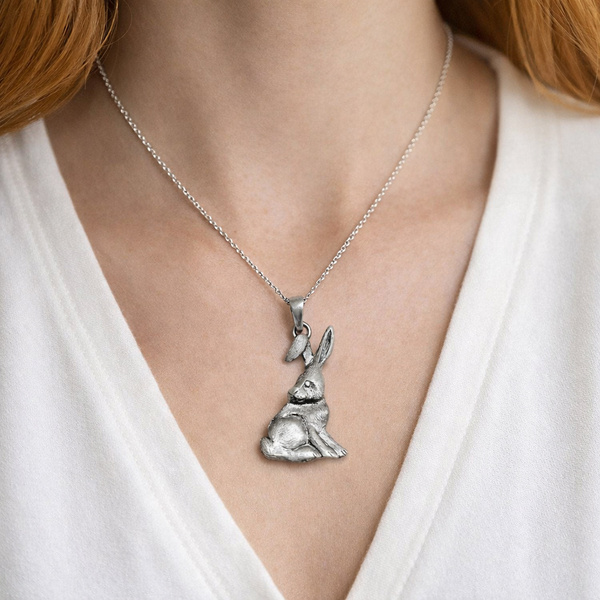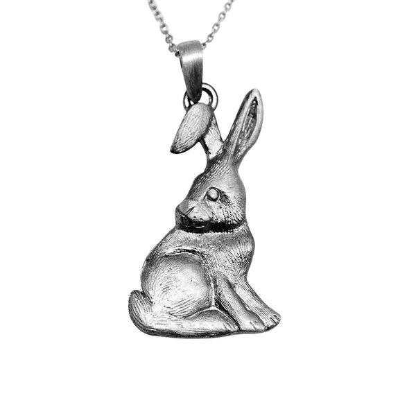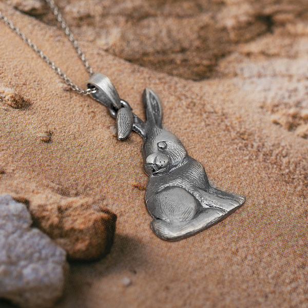 Zawieszka z sylwetką siedzącego zajączka. Całość została zaoksydowana, dzięki czemu cały wzór uzyskał unikatowy charakter stylu Vintage.