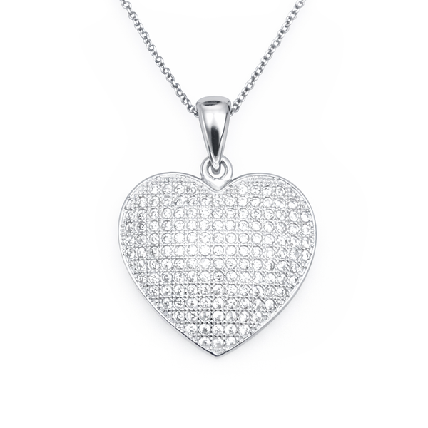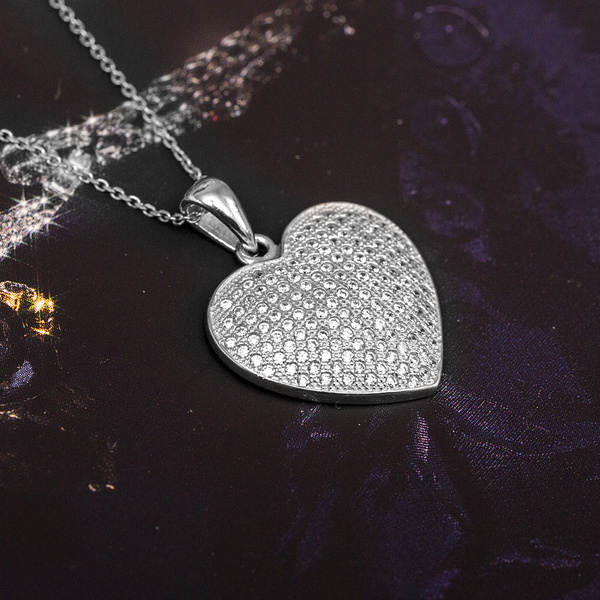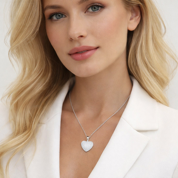 Uroczy naszyjnik wysadzany bezbarwnymi cyrkoniami, wykonany ze srebra p. 925 i pokryty rodem. Rod zabezpiecza srebro przed ciemnieniem.