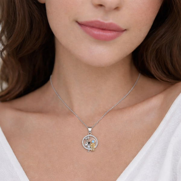 Wisiorek jest wysadzany cyrkoniami bezbarwnymi, jedną niebieską (kosmonauta) i czarną (kot).
