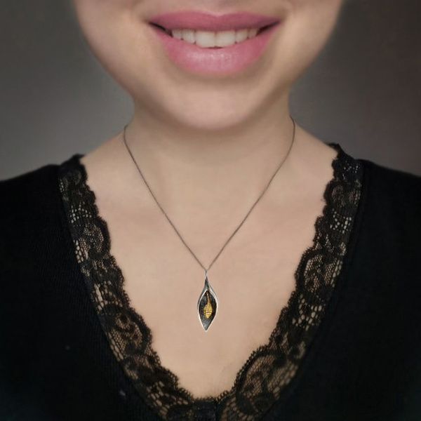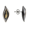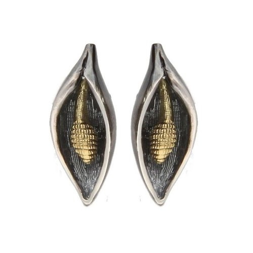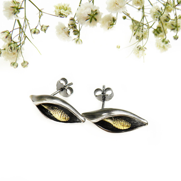 Przepiękne kolczyki - sztyfty w kształcie kwiatów, wykonane ze srebra próby 925, ręcznie wykończone oksydą i wypolerowane, ozdobione efektownym złoconym, mosiężnym pręcikiem.