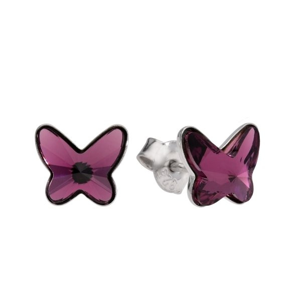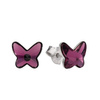 Srebrne kolczyki-sztyfty rodowane z Crystals from Swarovski w kształcie motyla w kolorze fioletowym.