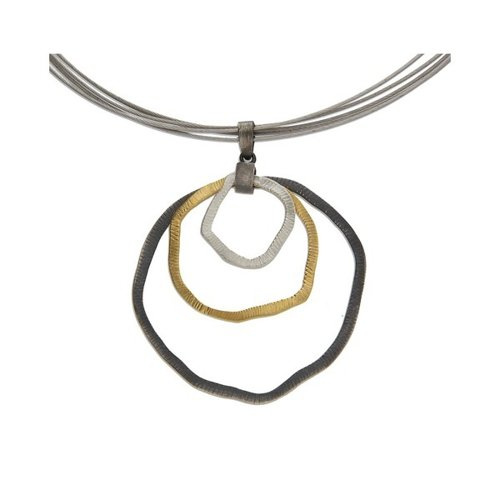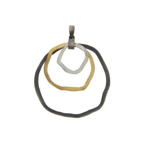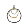 Oryginalny wisiorek wykonany z trzech kół - obręczy o różnych wielkościach. Dzięki zaoksydowaniu największego koło i pozłoceniu średniego kolczyki uzyskały efektowny, trójkolorowy charakter. Do kompletu można dokupić łańcuszek oraz kolczyki.