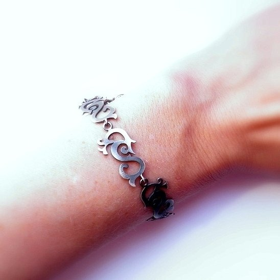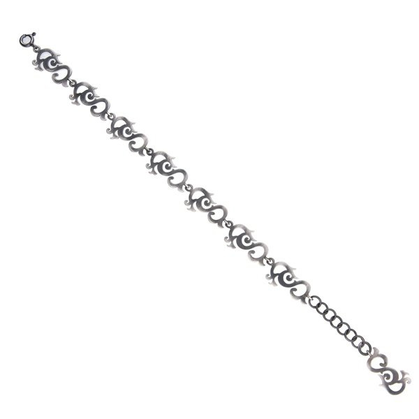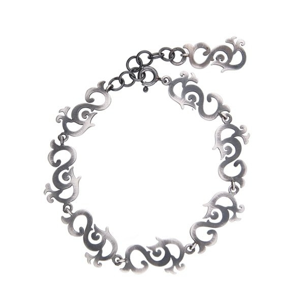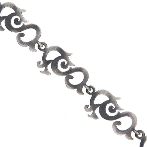 Piękna i niezwykle oryginalna bransoletka srebrna wykonana z siedmiu połączonych ze sobą ozdobnych elementów. Całość wykonana ze srebra próby 925, ręcznie pokryta oksydą i wypolerowana, dzięki czemu uzyskano śliczny efekt "starego srebra" w stylu Vintage. Długość bransoletki to 18,5 cm, dodatkowo posiada 2,5 cm łańcuszka do regulacji. Będzie wspaniałym prezentem dla każdej kobiety. Do kompletu można dokupić kolczyki.