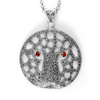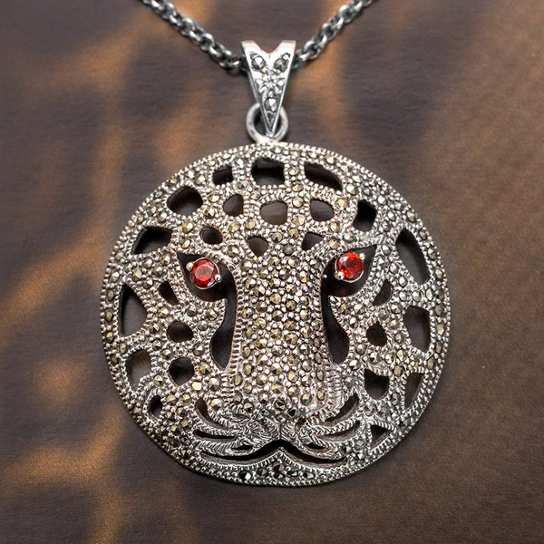 Cudna, przepięknie się mieniąca, srebrna zawieszka wysadzana markazytami i granatami w kształcie głowy tygrysa.