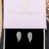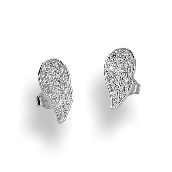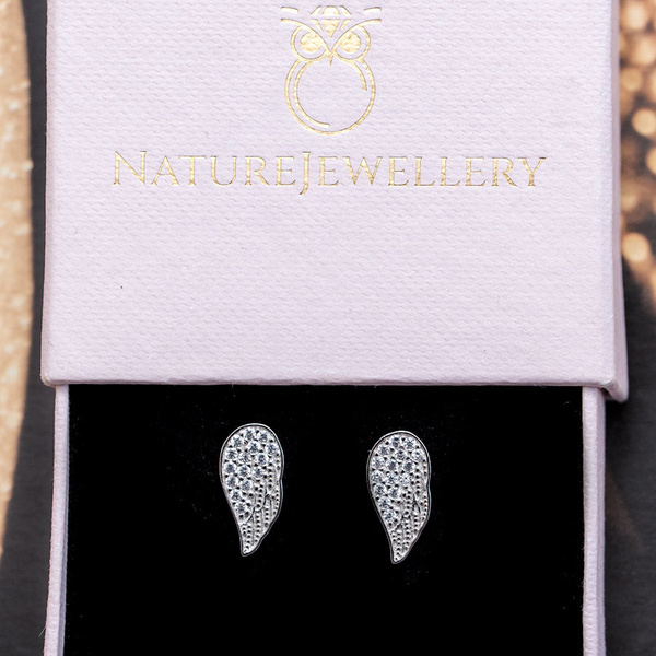 Piękne kolczyki w kształcie skrzydełek, wykonane ze srebra próby 925, ozdobione cyrkoniami najwyższej jakości.