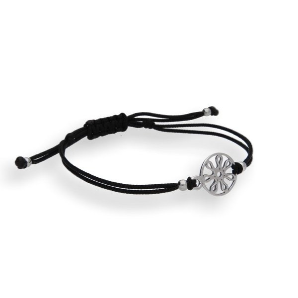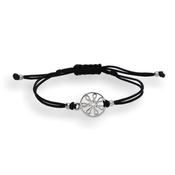 Przepiękna bransoletka sznurkowa z ozdobnym, okrągłym motywem wykonanym ze srebra próby 925. Modny i oryginalny wzór będzie pasował każdej kobiecie. Bransoletka świetnie podkreśli codzienne stylizacje.