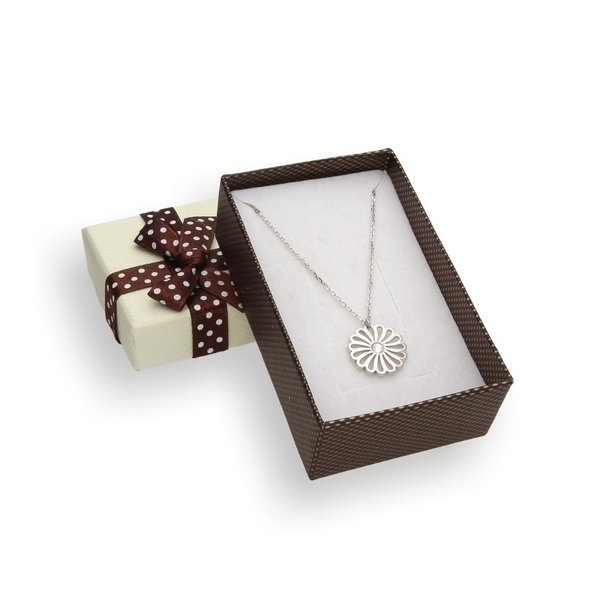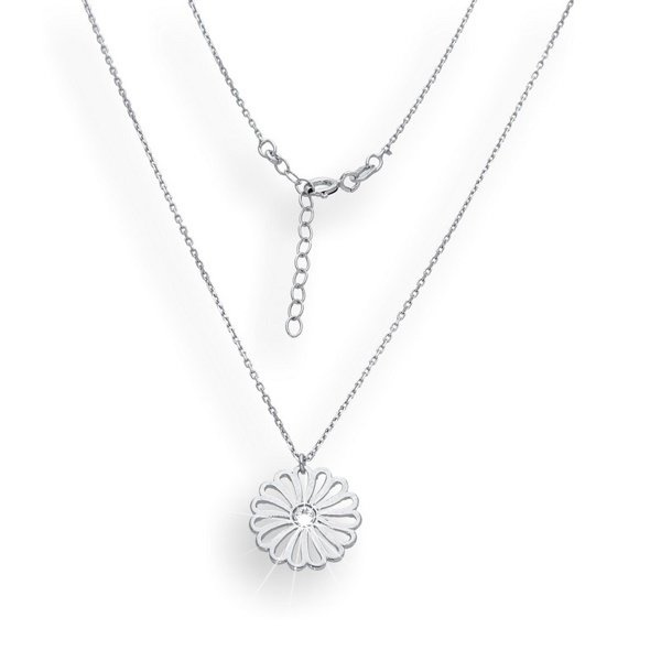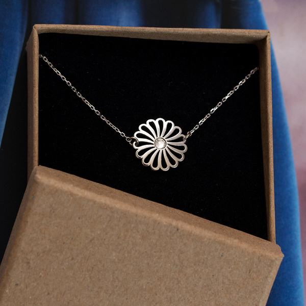 Przepiekny naszyjnik typu celebrytka, z przepiękną stokrotką, ozdobioną delikatną cyrkonią. Całość wykonano ze srebra próby 925.