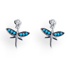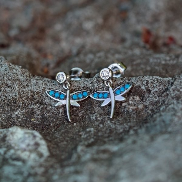 Rewelacyjne kolczyki srebrne, w formie malutkich ważek ozdobionych turkusowymi cyrkoniami, umieszczonych na sztyftach. Kolczyki będą świetnym pomysłem na upominek dla każdej miłośniczki przyrody, zarówno mniejszej, jak i większej.
